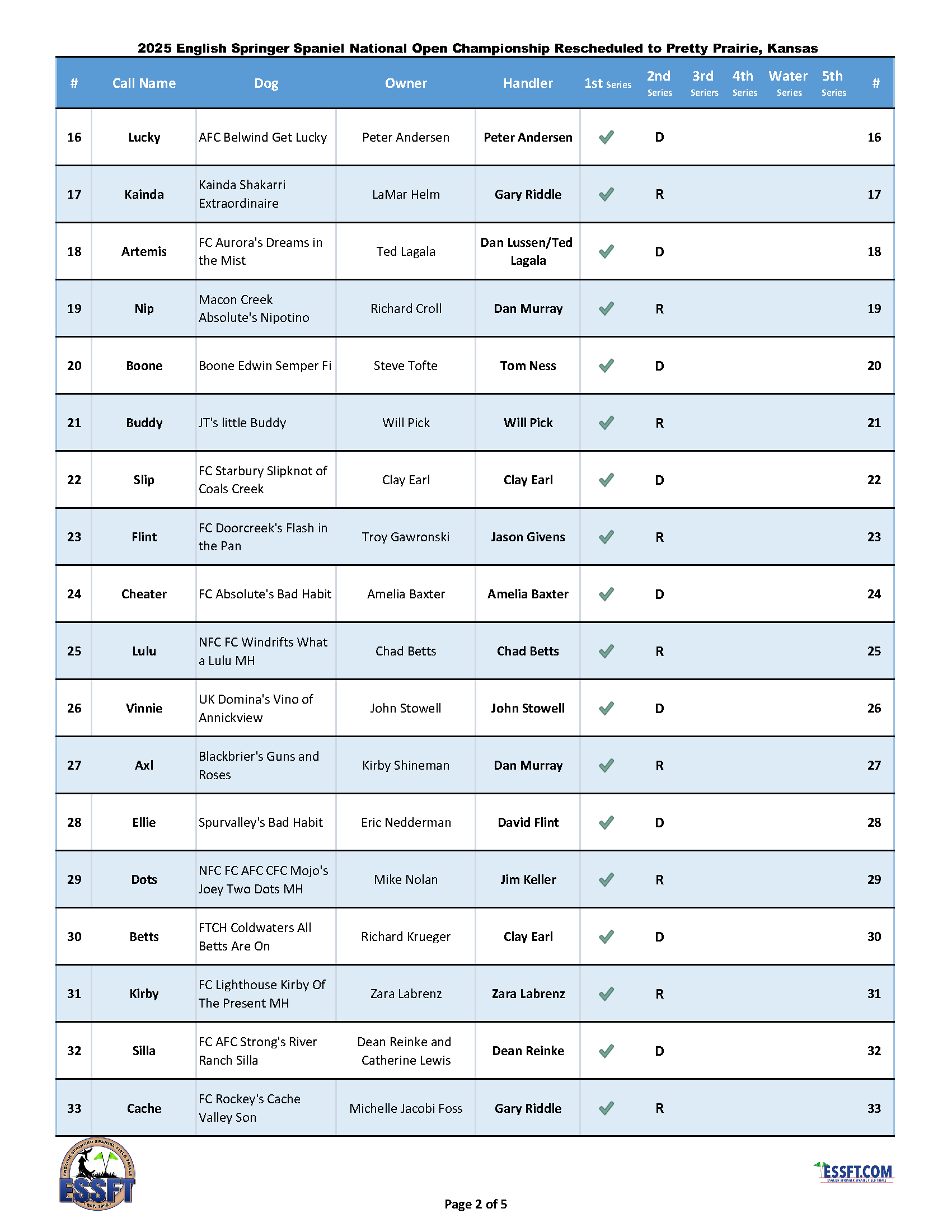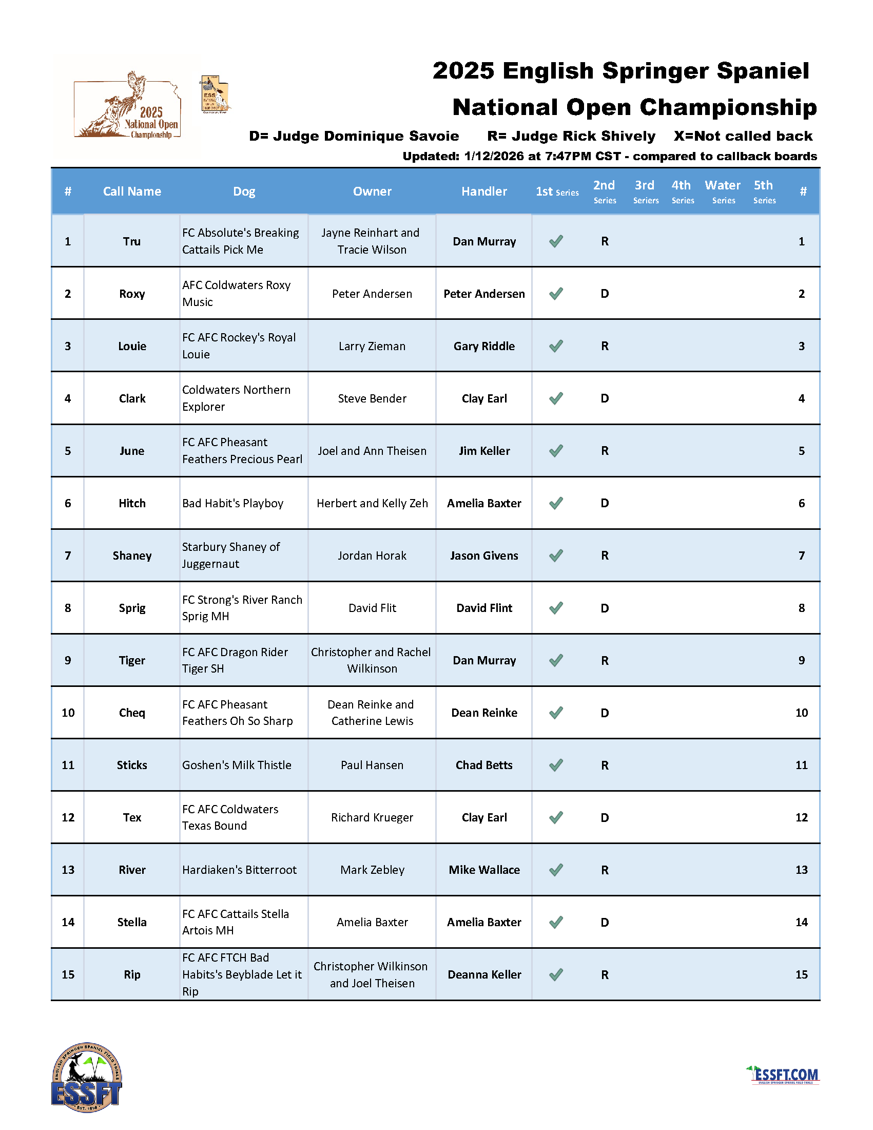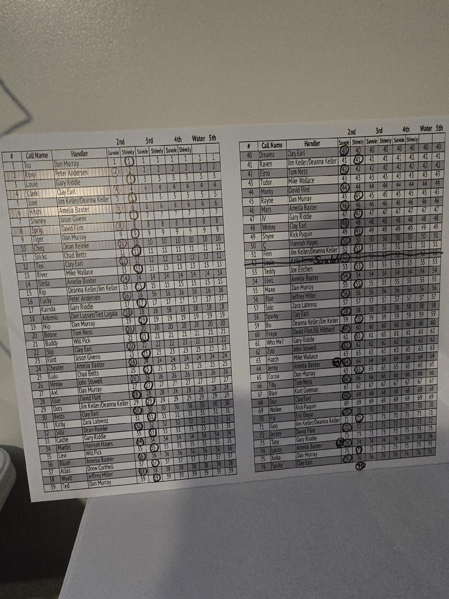 Based on the boards in the field, I am showing 68 dogs returning to the second series rather than 70, along with a few changes toward the end of the list. To ensure we are providing the most accurate information possible, this updated version reflects what is posted on the marshals’ boards rather than the earlier emailed sheet.