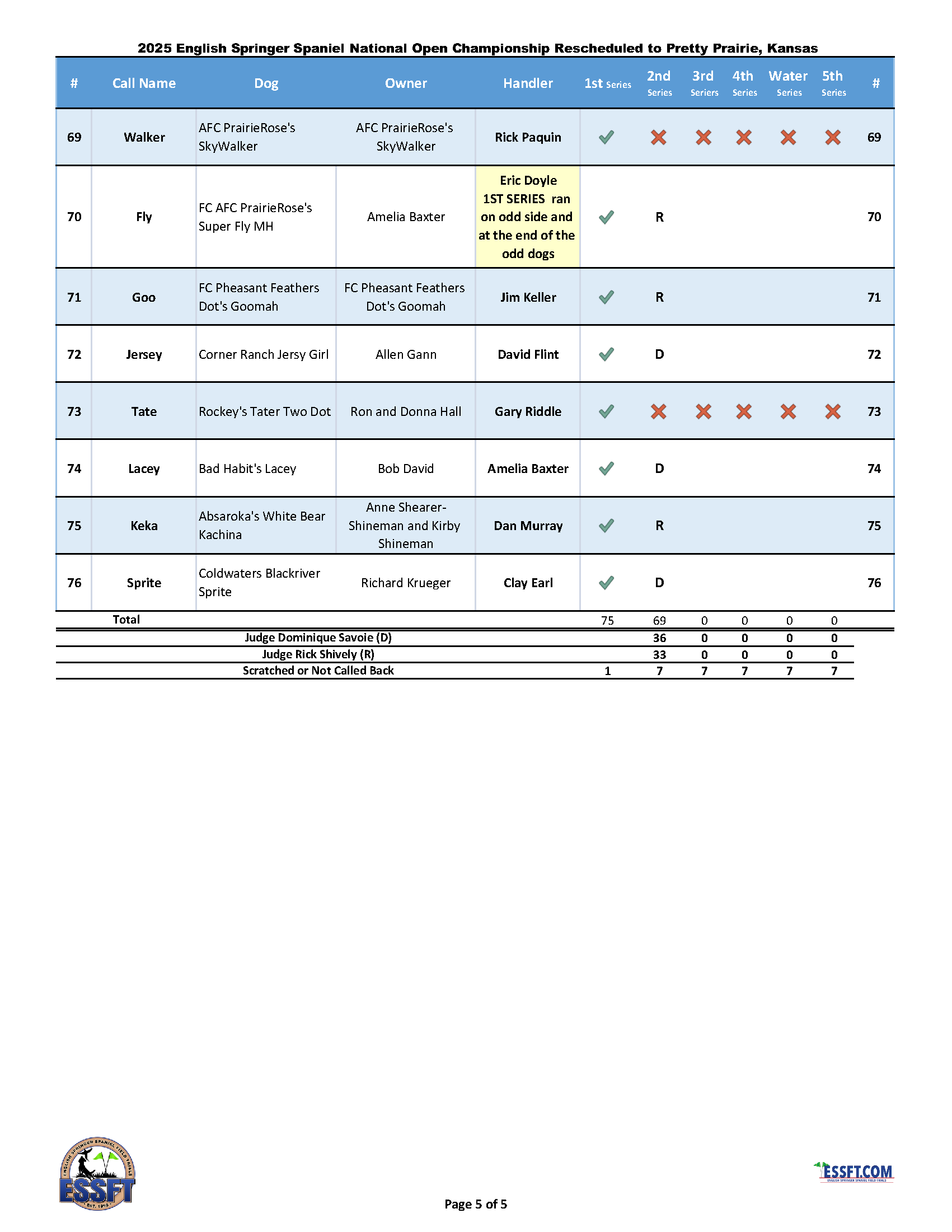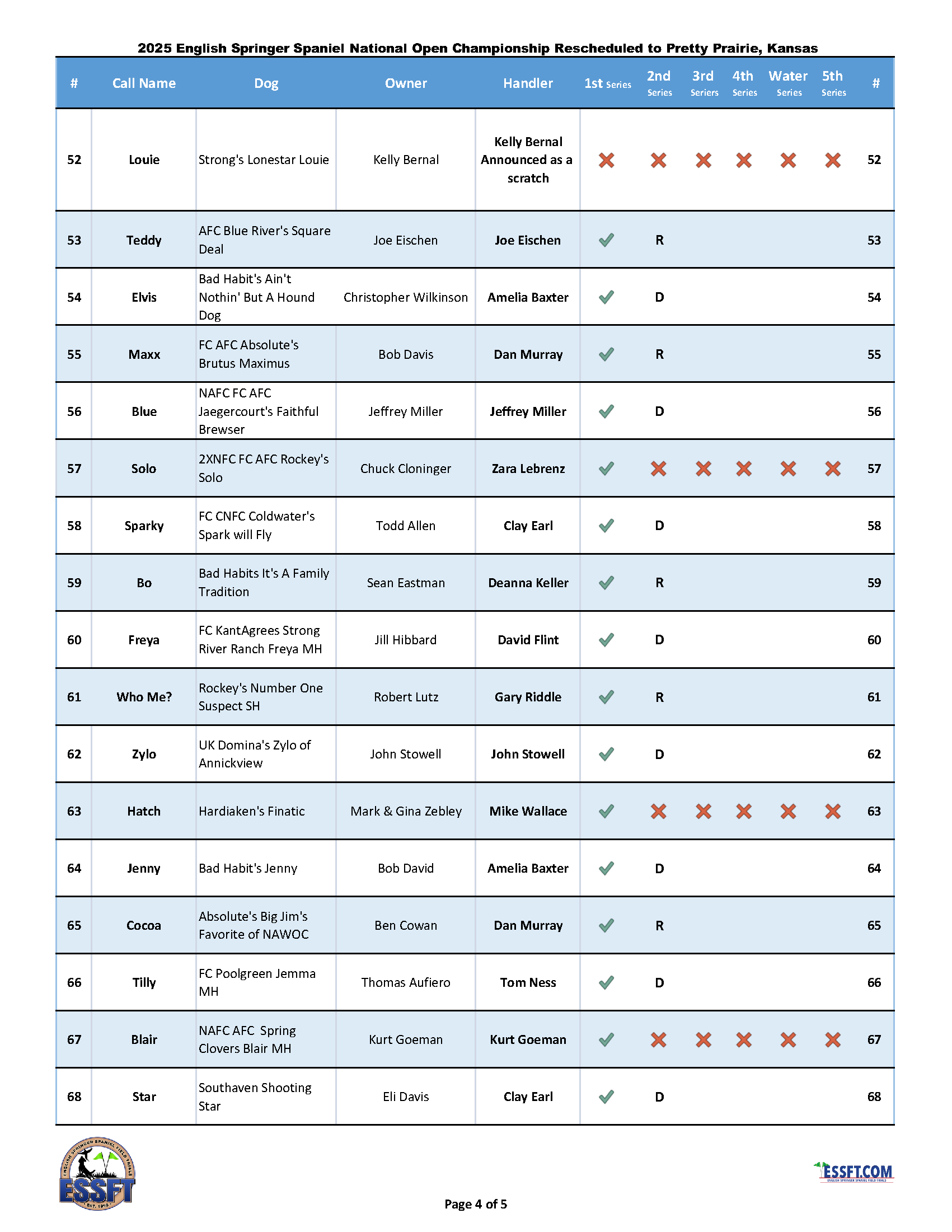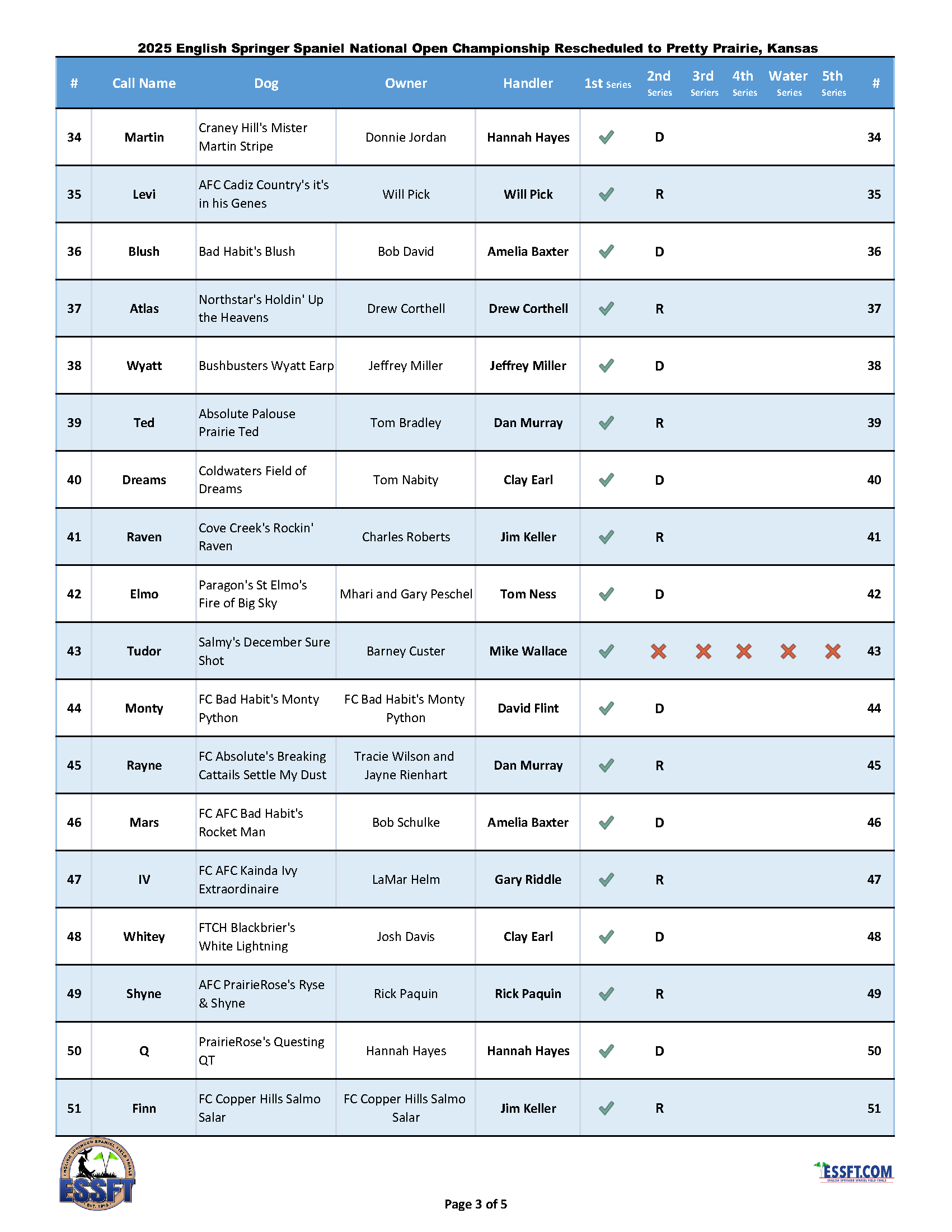 Based on the boards in the field, I am showing 68 dogs returning to the second series rather than 70, along with a few changes toward the end of the list. To ensure we are providing the most accurate information possible, this updated version reflects what is posted on the marshals’ boards rather than the earlier emailed sheet.